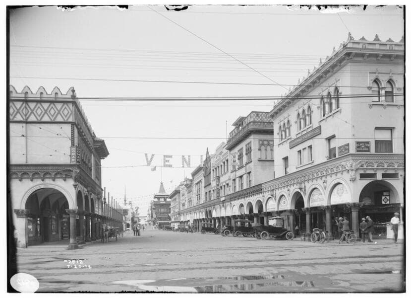 Southern California Views - An area view of Windward Avenue in Venice, California, [showing a Turkish Bath House, theaters, an apartment house and automobiles common to 1914 parked along the street. There is a large sign at the intersection that reads, VENICE]