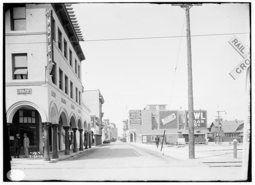 Southern California Views - Area view of Lorele Avenue in Venice, California, [showing real estate offices and advertisements, the Mallett apartment house, and the American Transfer Company. Pedestrians and automobiles common to 1914 are on the street.]