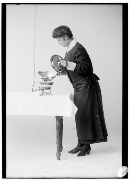 A3.1 - Appliances miscellaneous - Miss Shaw conducting a cooking demonstration with an electric cooking appliance. She is cooking a meal.