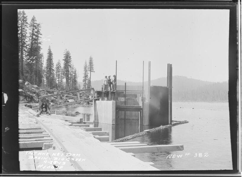 Big Creek - Huntington Lake, Intake Dam #1 - Showing forms for Intake and construction trestle for Dam #1.