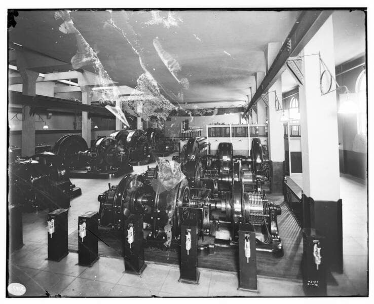 Los Angeles Substation #10 - Interior, showing the switchboard and machines [condensers.]