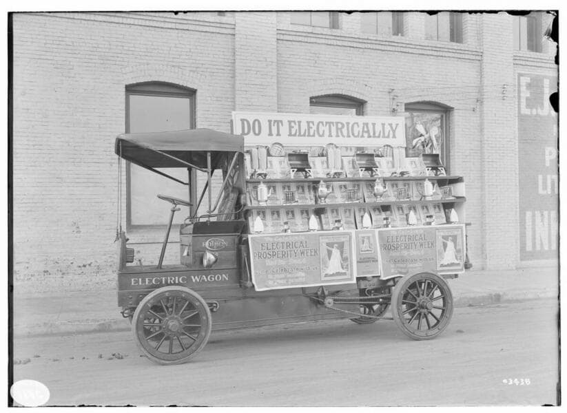 T3.1 Transportation - Autos, Trucks, & Railcars - Electric Wagon with appliances on display and driver at wheel.