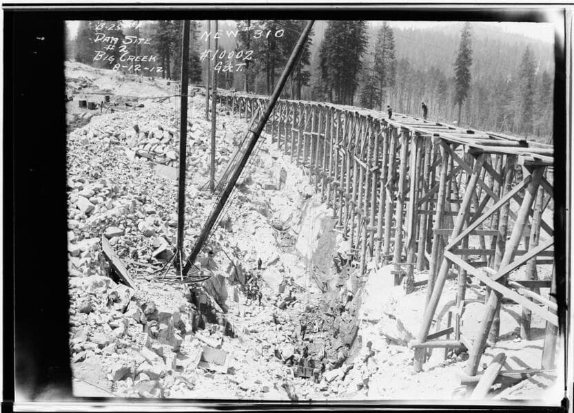 Big Creek - Huntington Lake, Excavation for Dam #2 - Showing trestle used during construction.