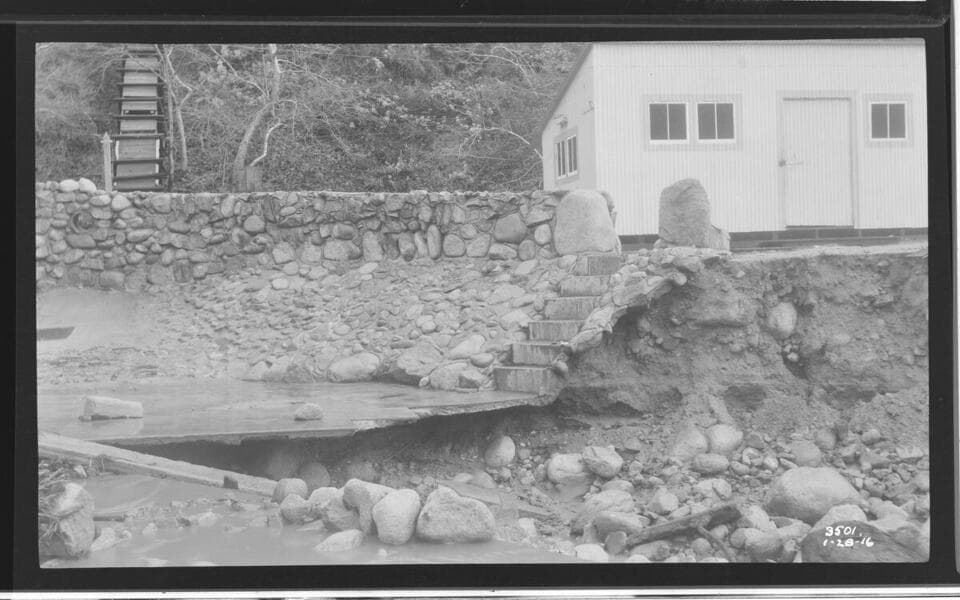 Santa Ana River #2 Powerhouse - SAR 2, damaged tailrace, lawn, and machine shop after storm