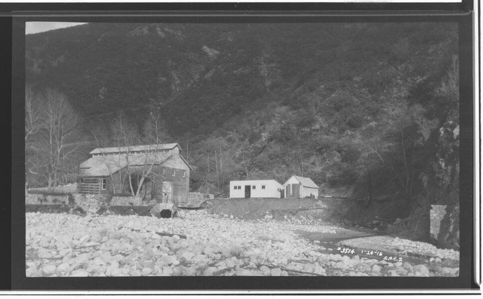 Santa Ana River #2 Powerhouse - SAR 2, machine shop and shed after storm [general view from river].
