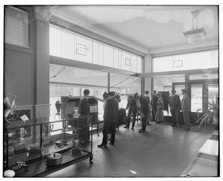 Local Offices A-Z - People looking at display of electric appliances at Santa Monica Office, collections at counter in the rear of the office.