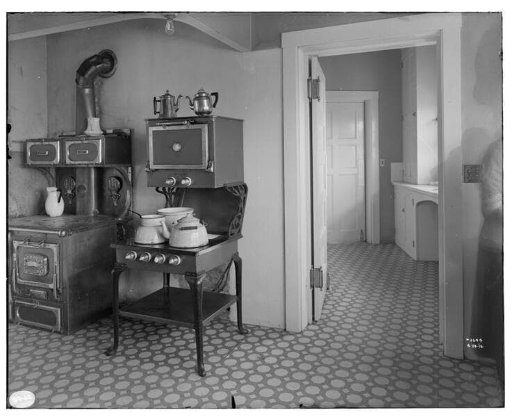 A3.3 - Ranges - Cook working in kitchen of Governor Gage's Home - [New Electric Range on left and old wood fueled range in alcove at end of kitchen]