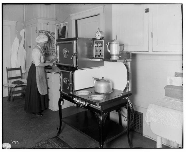 A3.3 - Ranges - Cook working in kitchen of Governor Gage's Home - [New Electric Range on left and old wood fueled range in alcove at end of kitchen]