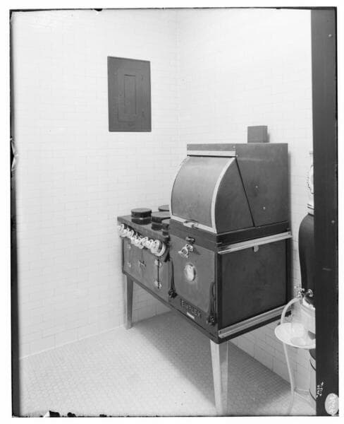 A3.3 - Ranges - Electric range at home of Lieut. Governor Wallace [new range set-up next to old wood burning range.]