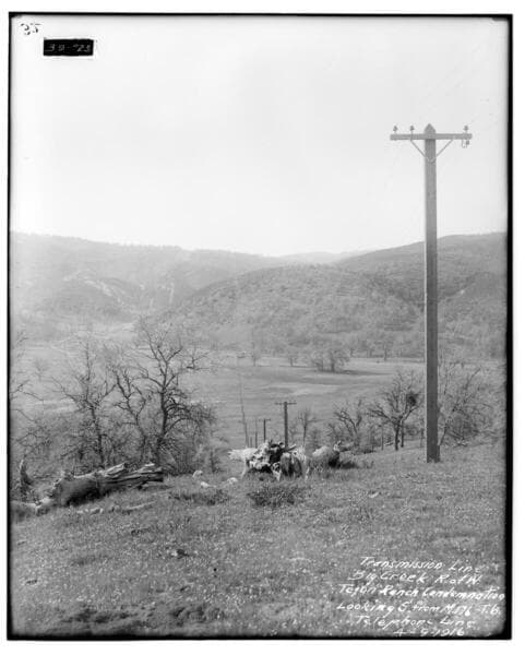 Big Creek T/L right-of-way - Taken in connection with Tejon Ranch condemnation suit. Looking South from point opposite Mile 166, Tower 5, showing telephone line.