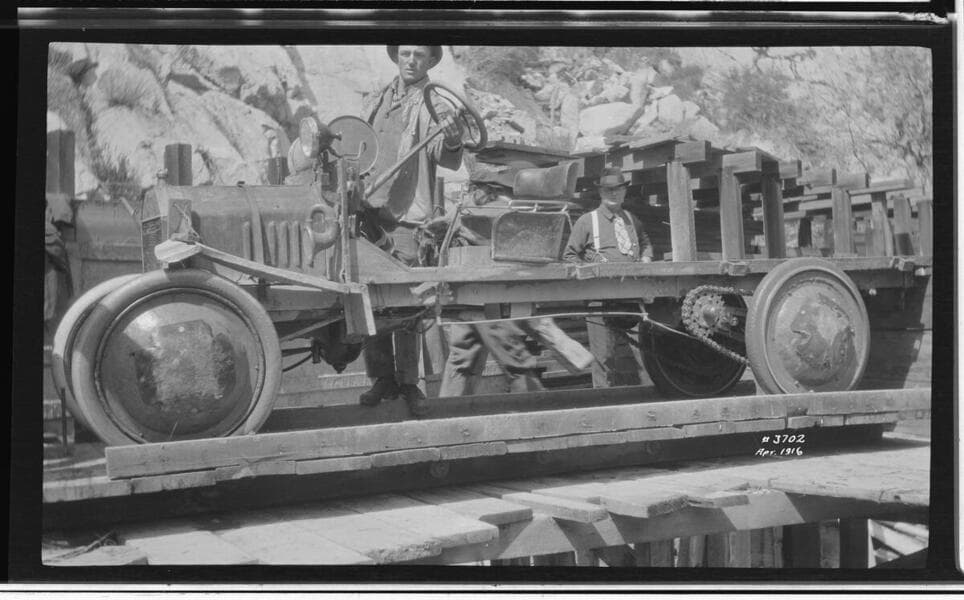 Santa Ana River #1 Powerhouse - Small Ford, narrow track modified truck working in tunnels at SAR 1