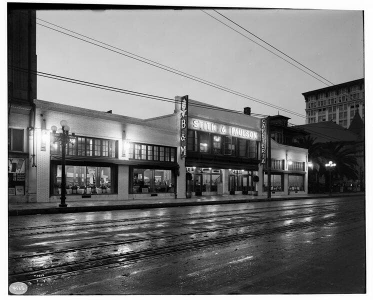 L1.3 - Lighting, stores - Night shot of the Merritt building at 8th and Broadway in Los Angeles