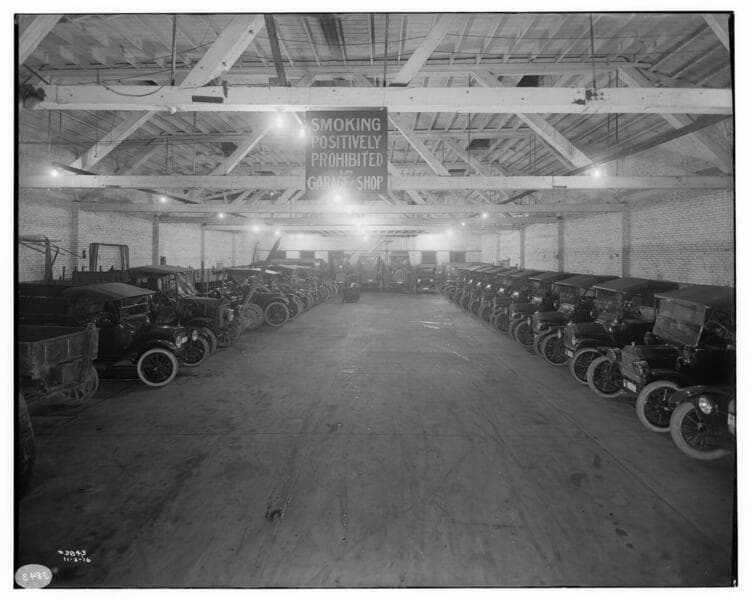 Miscellaneous Facilities - Los Angeles - Garage at East 1st. Street [interior shot with 20+ automobiles parked inside]