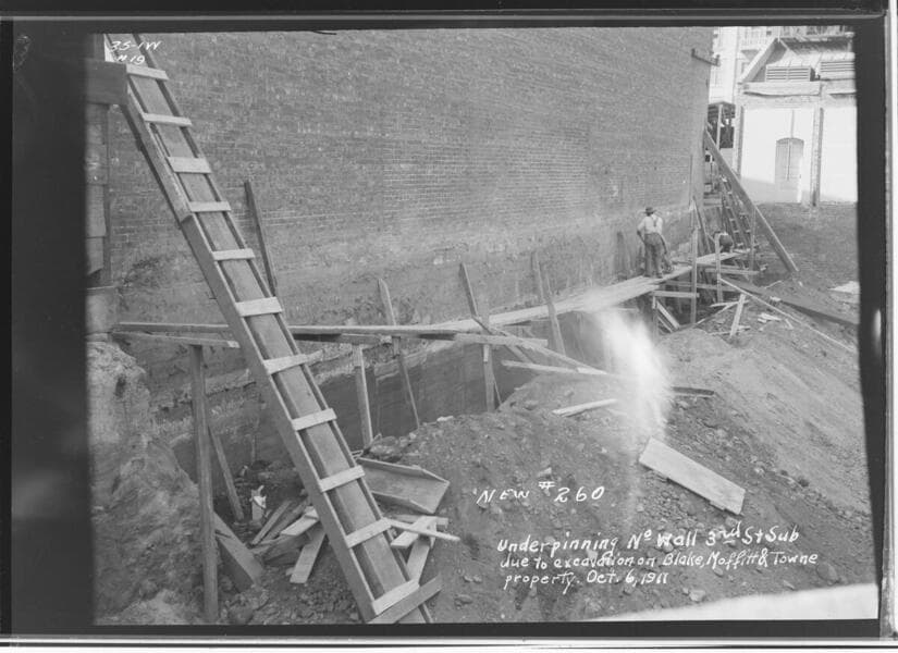 Third Street Substation - Placing additional underpinning under North wall, on account of excavation for Blake, Moffitt & Towne building.