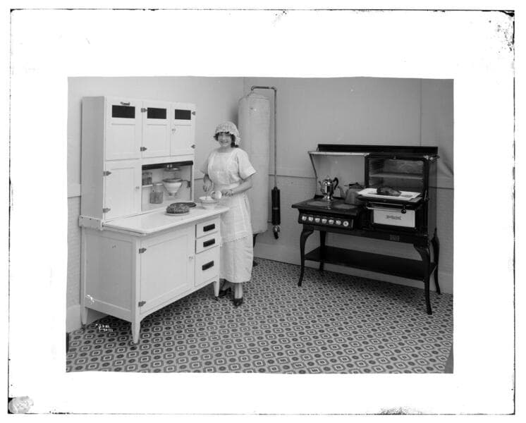 A3.3 - Ranges - Studio kitchen with Westinghouse Range and Aqua-Therm water heater. Miss Howell is taking bread out of the oven while child plays on the floor.