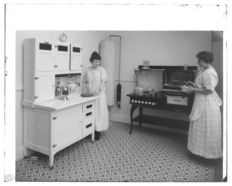 A3.3 - Ranges - Hotpoint range in studio kitchen with Miss Howell and Aqua-Therm [water heater].
