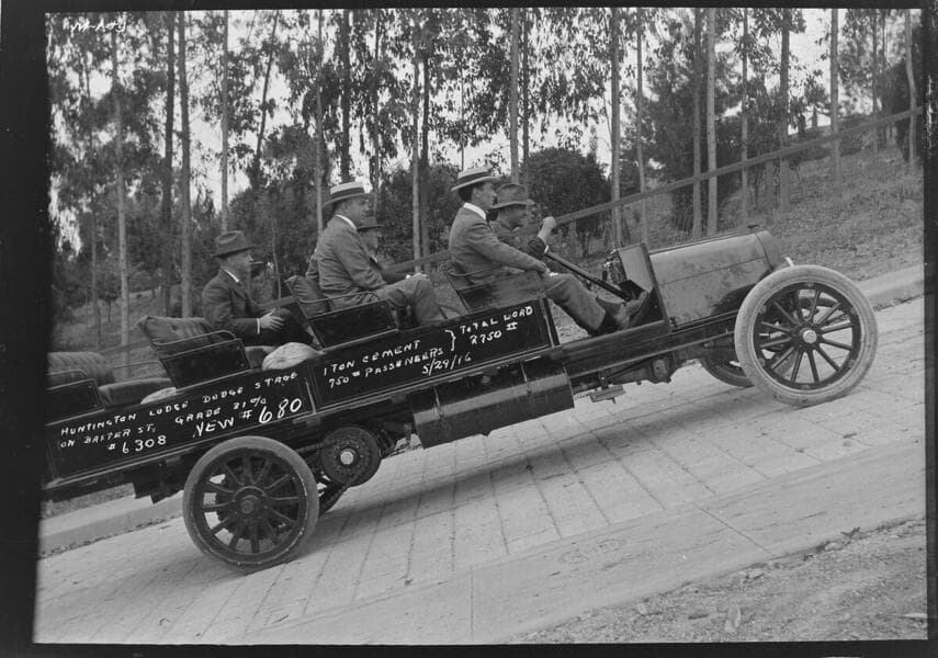 Automobile - Dodge Truck used as stage at Huntington Lake - Test load on Baxter Street Grade in Los Angeles (grade 31%) - total load is 2750 lbs.
