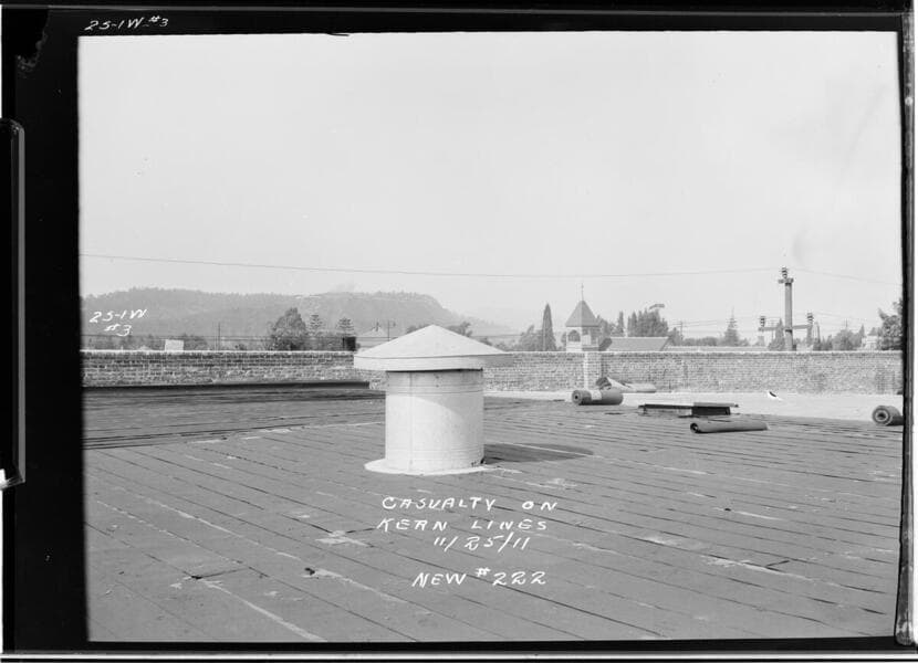 T/L - Borel to Kern Substation - West line on Workman at N. Broadway, L.A. - View of line with attached danger notice. Picture taken from roof of building on which workman was killed.