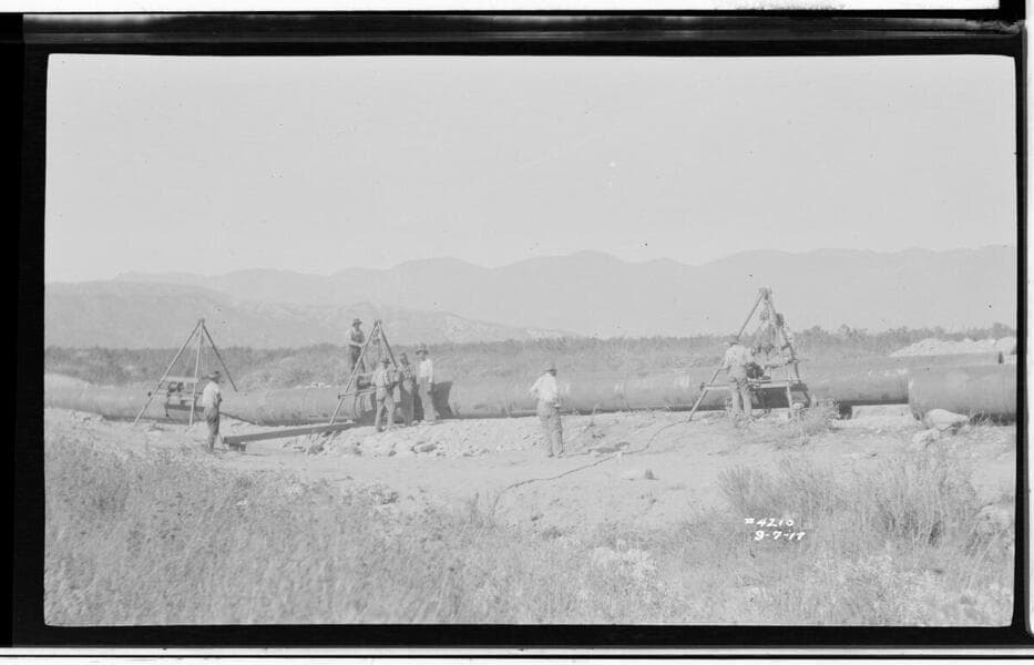 Lytle Creek, Fontana Powerhouse - Unloading 36" diameter sections of steel penstock pressure pipe for Fontana Power Company.
