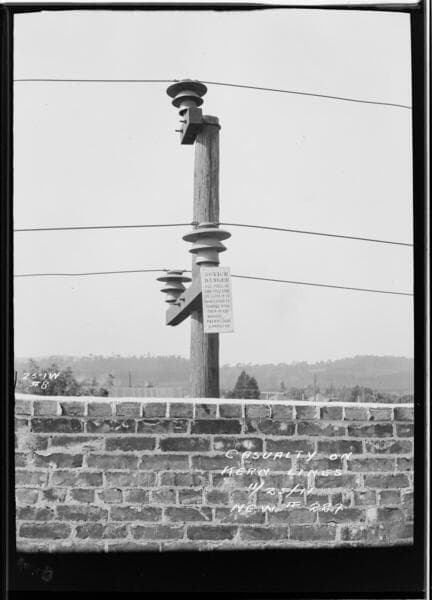 T/L - Borel to Kern Substation - West line on Workman at N. Broadway, L.A. - View of line with attached danger notice. Picture taken from roof of building on which workman was killed.