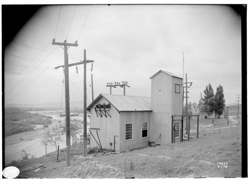 Pedley Powerhouse on the Santa Ana River. PL&P may have called this plant the "Riverside Powerhouse" also.