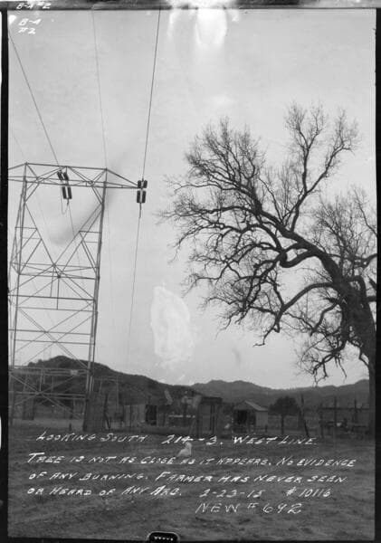 Big Creek T/L - Mile 214 - Tower 3, West line. Showing tree near line. Tree is not as close as it appears in picture. Farmer has never heard of or seen any arc.
