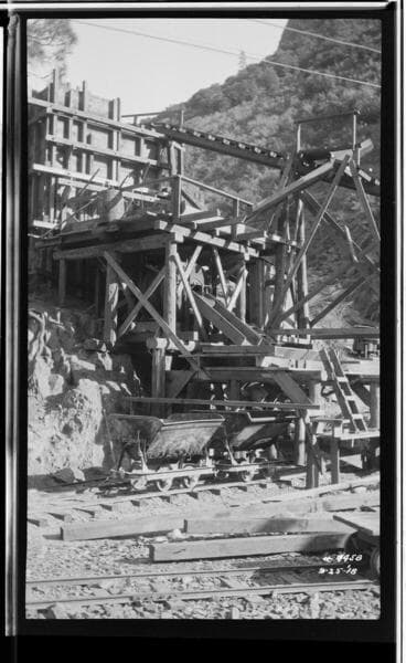 Borel Powerhouse - Kern River Borel 3rd stage - American Pipe Company's field plant for fabrication of pipe siphons. Lowering outer steel form for 10'6" diameter by 16' long section of concrete pipe. Progress picture during construction of overflow dam.