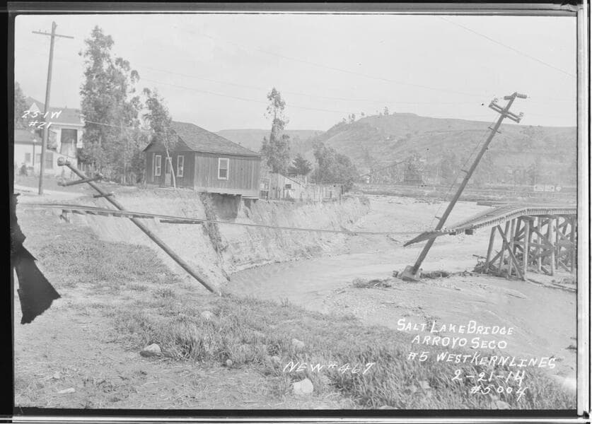 T/L - Eagle Rock to Kern Substation (#5 East & West Kern Lines) - Showing preparations for repairing damage done by flood. Taken near Salt Lake R.R. Bridge over Arroyo Seco at Cypress Avenue, Los Angeles.