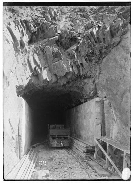 Kern River No. 3 - Camp 2 - Portal of lower 22 [men with railroad cart at tunnel entrance].