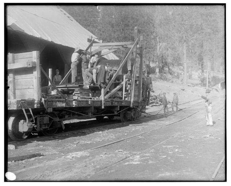 Big Creek Huntington Lake Dams - Big Creek [Railroad locomotive and car with men setting up spool of conductor or cable.]
