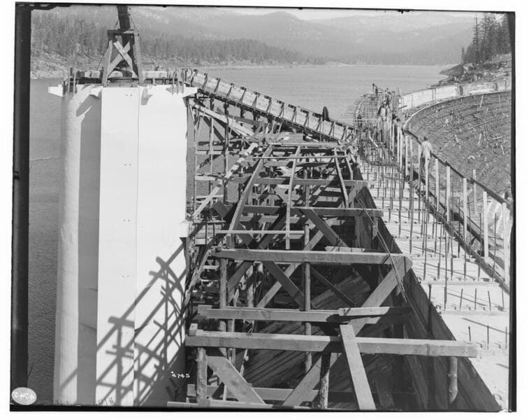Big Creek Huntington Lake Dams - Intake tower being raised with Dam 1 at Huntington Lake