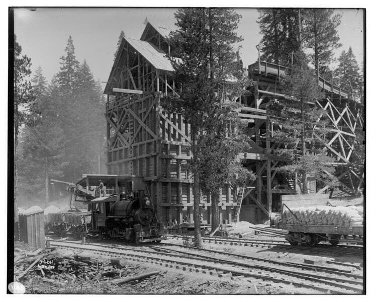 Big Creek Huntington Lake Dams - Rock Crusher Plant. [Railroad access to the multi-story wood building is on top and on the bottom. A locomotive is parked at the bottom.]