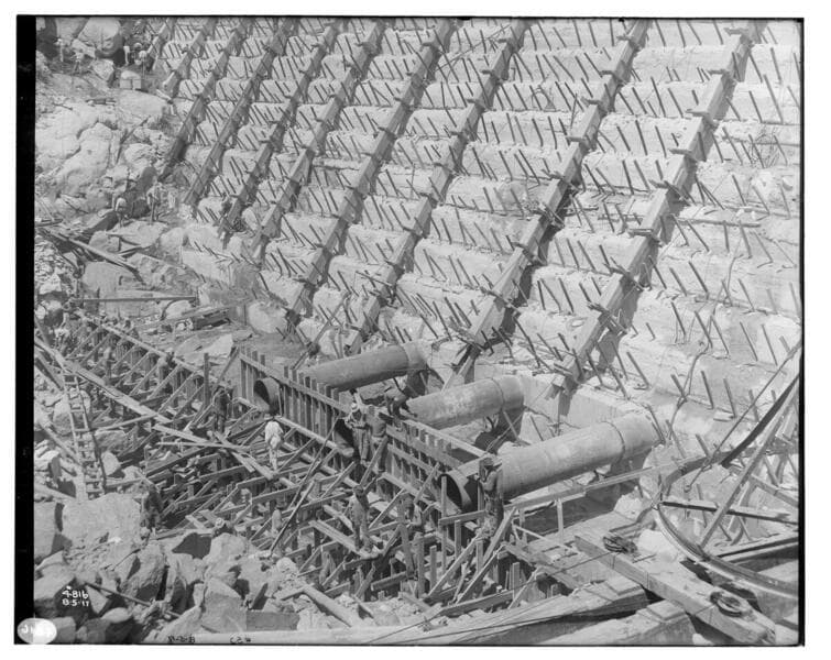 Big Creek Huntington Lake Dams - Dam #1 [Reconstruction on Sluice Pipes during extension project, showing old gates].