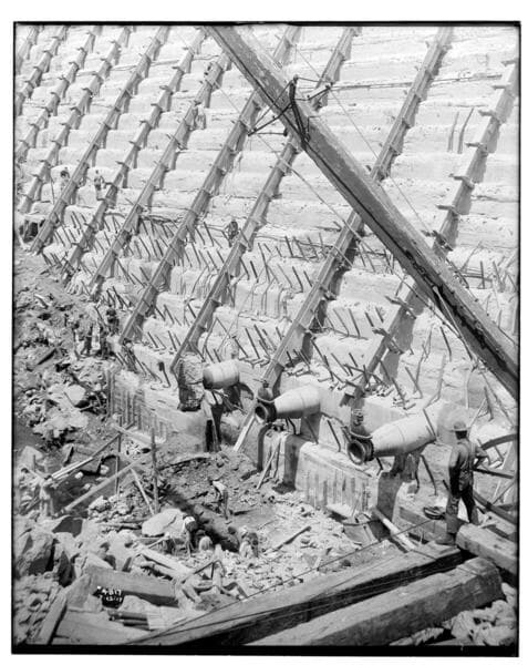 Big Creek Huntington Lake Dams - Dam 1 [Construction forms at base near sluice gate pipes.]