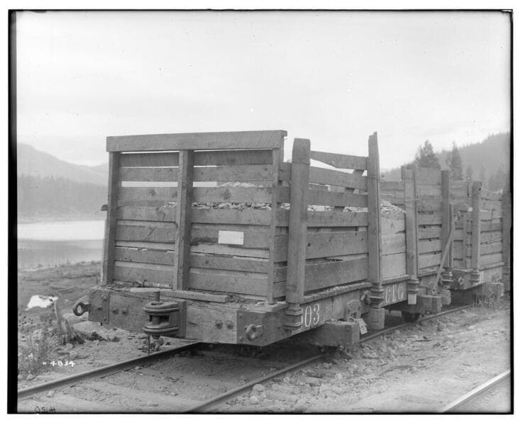 Big Creek Huntington Lake Dams - Rock Crusher Plant [Steam Locomotive #1 with dump cars being filled with aggrigate or gravel]
