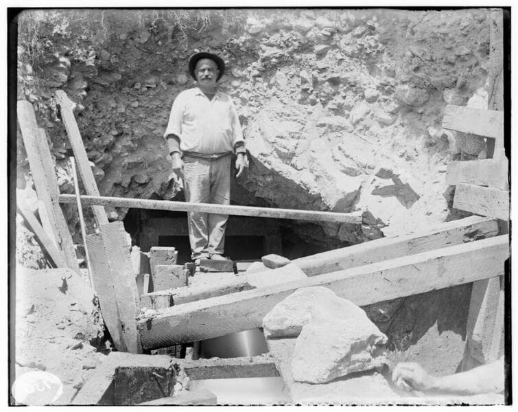 Tunnel construction on Mill Creek #3 Hydro Plant line. A member of the construction crew is standing in the tunnel.