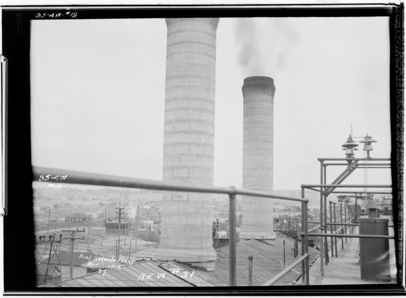 Long Beach Steam Station, Plant #2 - First view taken of stacks from roof.