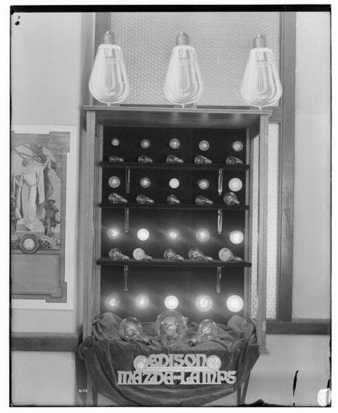 Lamp Dept. - display in Edison's 4th Street Office of the new Edison "Mazda" electric light bulbs. First bulbs to achieve modern levels of brightness and efficiency.