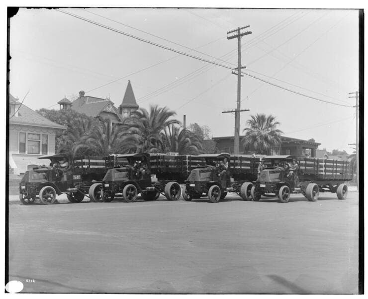 4 Edison Mack Bulldogs lined up on Hill Street, front view