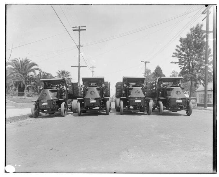 T3.1 Transportation - Autos, Trucks, & Railcars - 4 Edison Mack "Bulldog" Trucks with trailers lined up in front of SCE's general garage