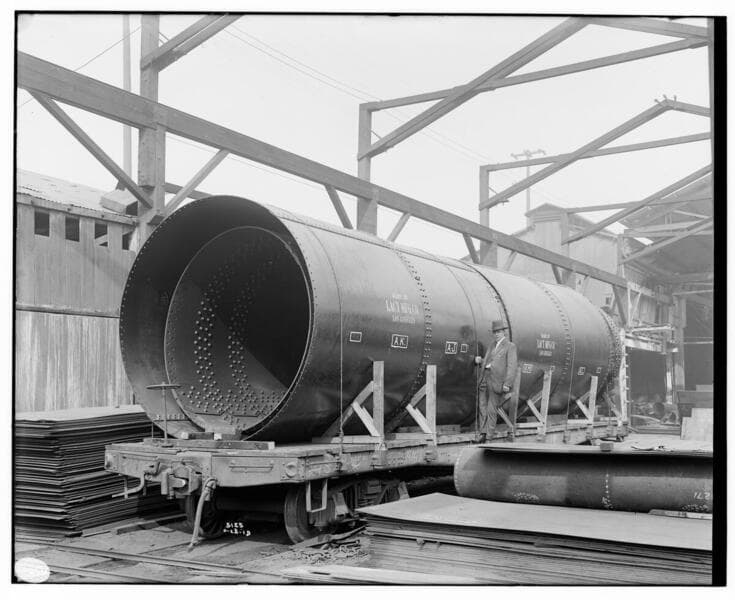 Kern River No. 3 - 1st loaded siphon pipe on car at Lacy Mfg. Co.