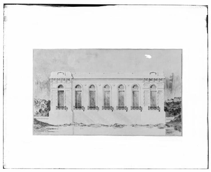Kern River No. 3 - Proposed KR 3 powerhouse - [preliminary study, architectural rendering. Building has eight arched windows in front with three arched windows on the side.]