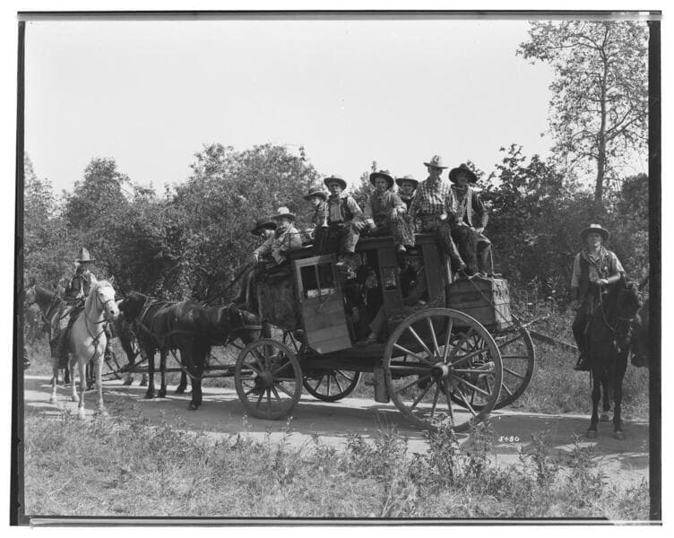 P1.1 - Group Portraits - National Electric Light Association - Arriving delegates at Santa Fe depot in Pasadena are arrested by cowboys and transported in a stagecoach to the Huntington Hotel.