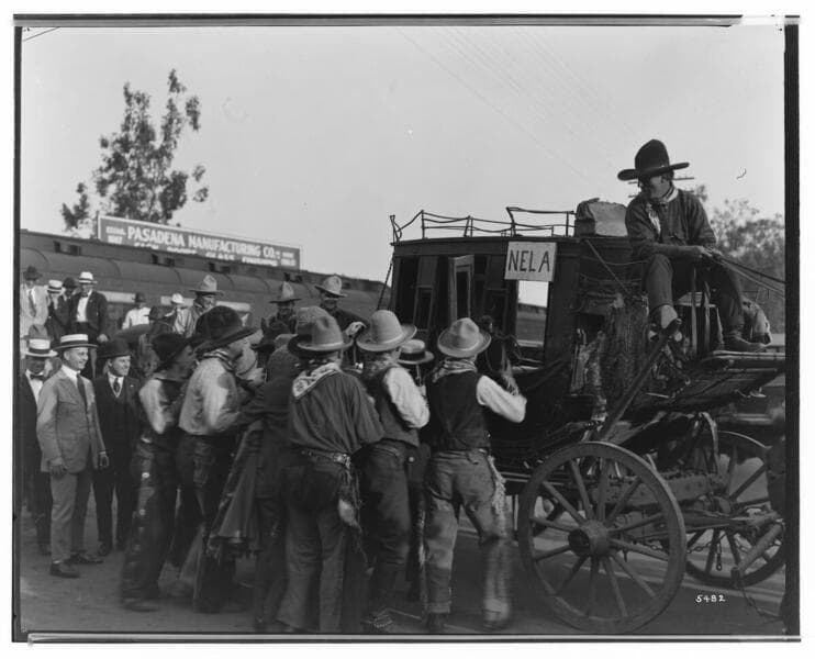 P1.1 - Group Portraits - National Electric Light Association - Arriving delegates at Santa Fe depot in Pasadena are arrested by cowboys and transported in a stagecoach to the Huntington Hotel.