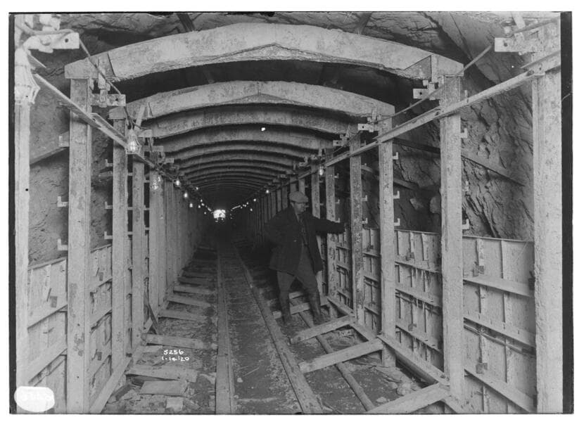 Kern River No. 3 - tunnels - steel concrete forms up [Man standing under steel framework used to hold forms for sides and ceiling of tunnel. ]