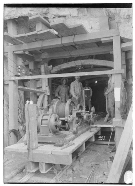 Kern River No. 3 - Men standing in tunnel by winch used for pulling in car loaded with concrete.