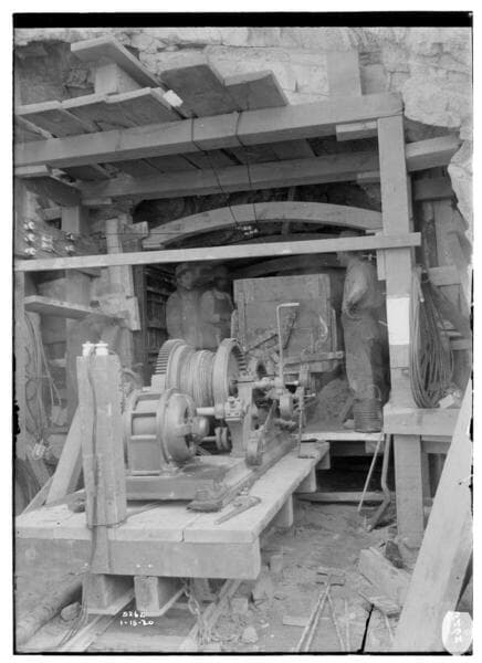 Kern River No. 3 - Men standing in tunnel by winch used for pulling in concrete.