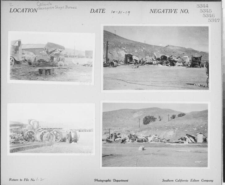 Miscellaneous Facilities - Caliente - Garages & shops burned. [plus one additional, similar shot of fire damage (#5349) on same photocard]