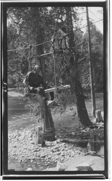 Big Creek, Florence Lake Dam - Florence Lake Trip - [man crossing river in overhead cable car.]