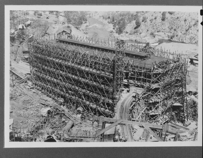 Big Creek Powerhouse #3 - Staging and concrete plant, PH 3, showing combination track layout. [View of Powerhouse, and part of penstock ditch during early form construction]